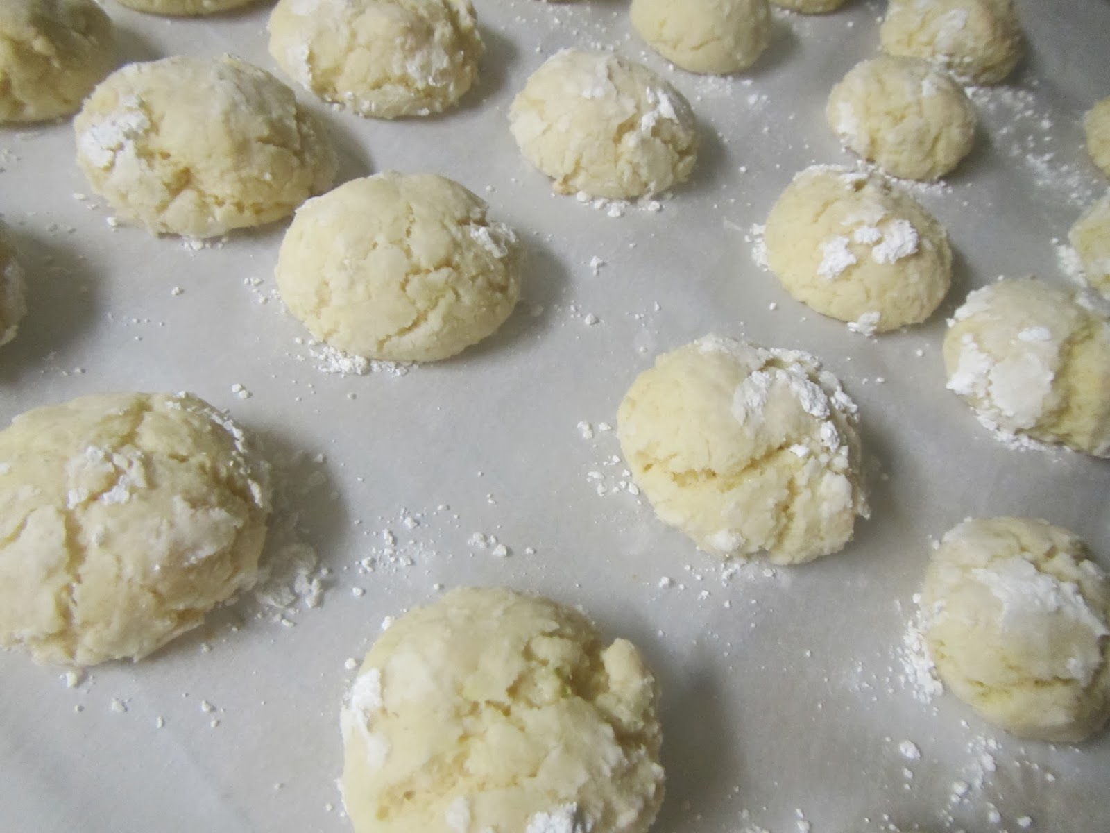 Form 1 inch balls, lightly coating them with sugar as you put them onto a baking sheet covered with parchment paper. Note: This is only half of the recipe! I got maybe 25-30 cookies out of this recipe.